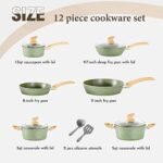 Kitchen Cookware Set 12 piece – Include 8-inch fry pan / 11-inch fry pan / 9.7-inch Deep Fry Pan with lid / 1.5Q saucepan with lid / 3Q casserole with lid / 5Q casserole with lid / 2 pcs silicone utensils. The Interchangeable lid can be used for fry pan. Easy Clean & hand wash recommend!