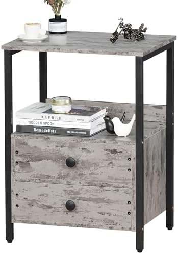 【2 drawers & Double Shelf】 Keep your essentials within easy reach with this night stand with drawers. It comes with two wooden drawers and an open shelf, where you can place items like a record player, printer, books, desk lamp, etc. and the drawers have enough space to store your personal items, this grey end table guarantees aesthetics and brings practicality at the same time.