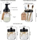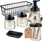 ✅STYLISH STORAGE – Creat depth, texture and a beautiful space by using the mason jar bathroom accessories set.It’s a cute shabby chic black home accessories set you can get!Keeps the bathroom both organized and adds a simple rustic style to it.Ideal cute farmhouse decor!Reusable, refillable, eco-friendly, recyclable glass.304 Stainless Steel components prevent rust and corrosion!