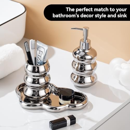 Minimalist Elegance: This 3-piece silver ceramic bathroom accessories set is a testament to minimalist design, offering a clean, uncluttered aesthetic. Each piece, including the tray, lotion dispenser, and tumbler, exudes an understated yet sophisticated charm.