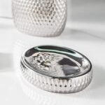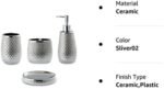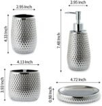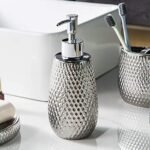 This Bathroom Accessory Set is uniquely designed with raindrop shape, silver plating to create deluxe bathroom decoration, the silver bathroom accessory set and decor includes a lotion/soap pump dispenser, a toothbrush holder, a tumbler and a dish.
