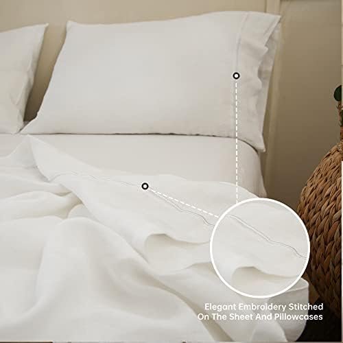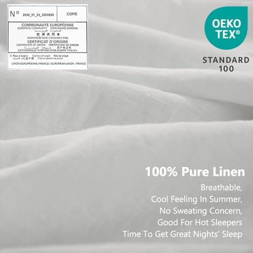 MATERIAL — Made of 100% Premium Quality French Flax Fabric with Pre Washed, 160 GSM (For making the fabric soft, the pre-washing process will cause an uncontrollable shrinkage, so the final GSM will have 5% more or less deviation). Use the exquisite craftsmanship stitch with the elegant embroidery on the sheet and pillowcase. Our linen products has been certified according to STANDARD 100 by OEKO-TEX, which is eco-friendly.